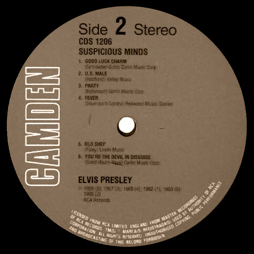 Side 2 of SUSPICIOUS MINDS (Camden, 1982; from Tygrrius’ collection) | Click image for full-color version