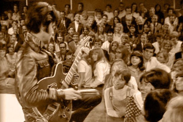 Elvis Presley plays electric guitar for fans during taping of 1968’s ELVIS special (NBC)