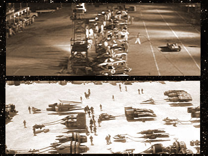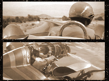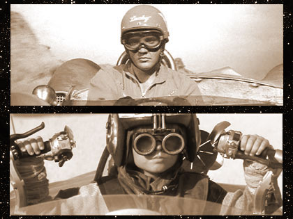 Elvis checks to the right, wearing a lightning bolt on his helmet. (This actually looks a lot like the TCB lightning bolt that Elvis would later use as a personal emblem.)