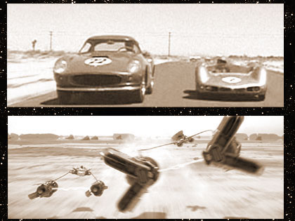 Elvis pulls alongside the leader, who has a much bigger racecar than he does.
